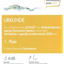 Unsere Schülerzeitung SCHULZ belegte beim Sächsischen Jugendjournalismuspreis 2020 den ersten Platz in der Kategorie „Schülerzeitung Gymnasium".
